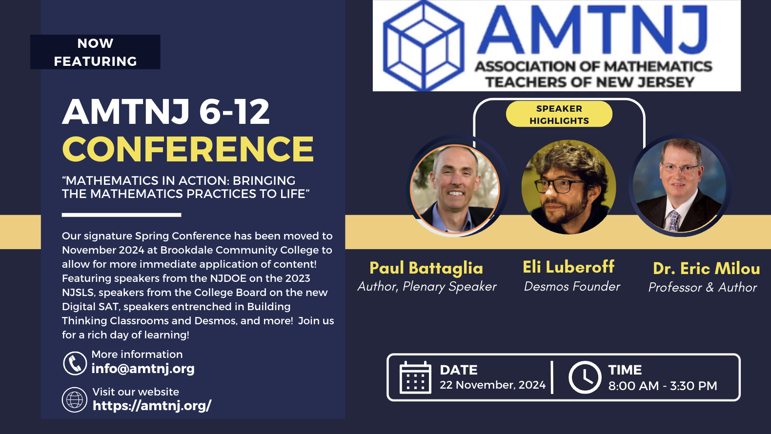 Our secondary conference, “Math Practices in Action”, is a special one-day mathematics content conference on Friday, November 22, 2024, at Brookdale Community College. We will feature a number of content and pedagogy sessions related to teaching and learning in grades 6-12, including special sessions on inclusion, new developments in mathematics education (pathways, AP Precalculus, Digital SAT, and more), middle school math teaching, and more.